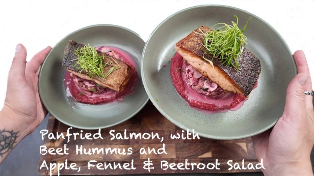 - Panfried Salmon, with Beet Hummus and Apple, Fennel, Cucumber & Beetroot Salad