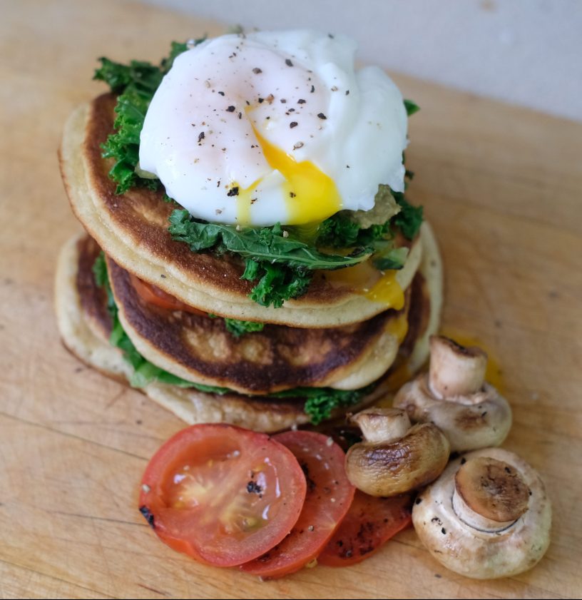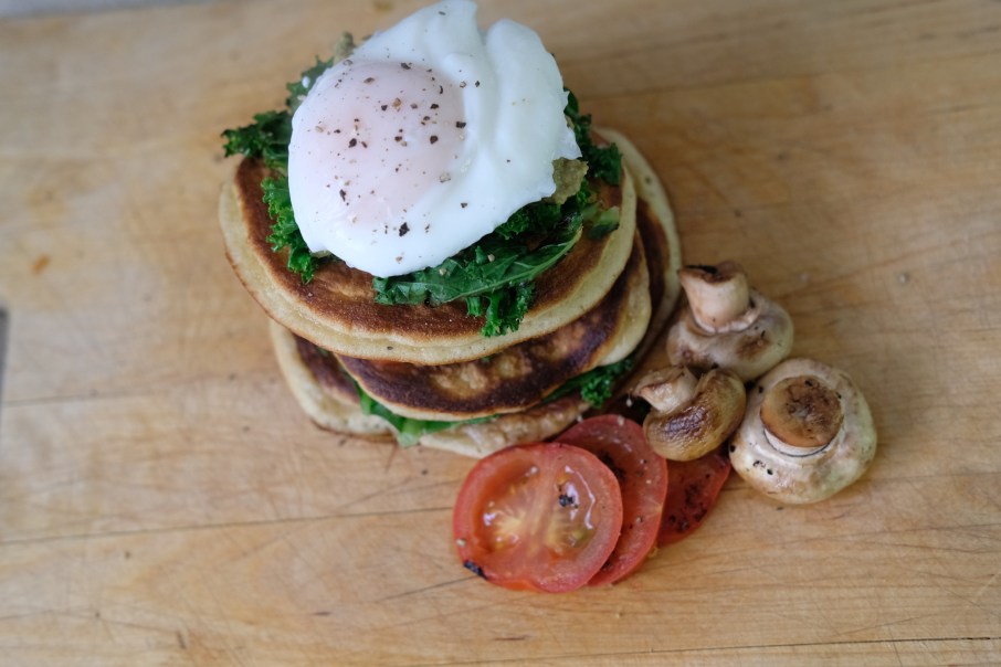 Purposely left for breakfast. The spare dorayaki – pancakes (click for recipe) layered with lightly panfried kale in lemon juice and sliced cooked tomatoes. A spoonful of guacamole on top, sided with panfried button mushrooms. Completed with an oozing poached egg on top.