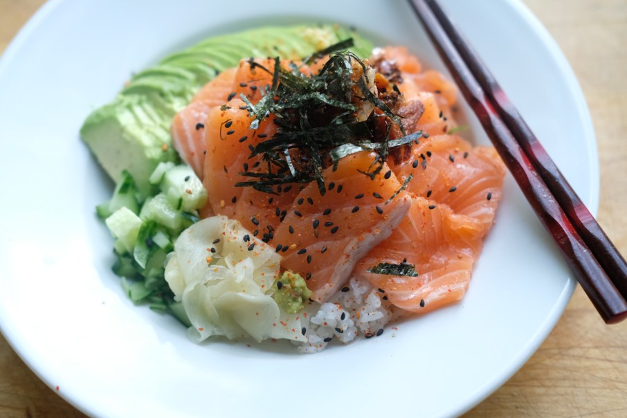 - Add the strips and dices of cucumber. Add the salmon cubes. Layer the salmon slices fancily on top of the rice. Flake the cooked salmon skin onto the sashimi.