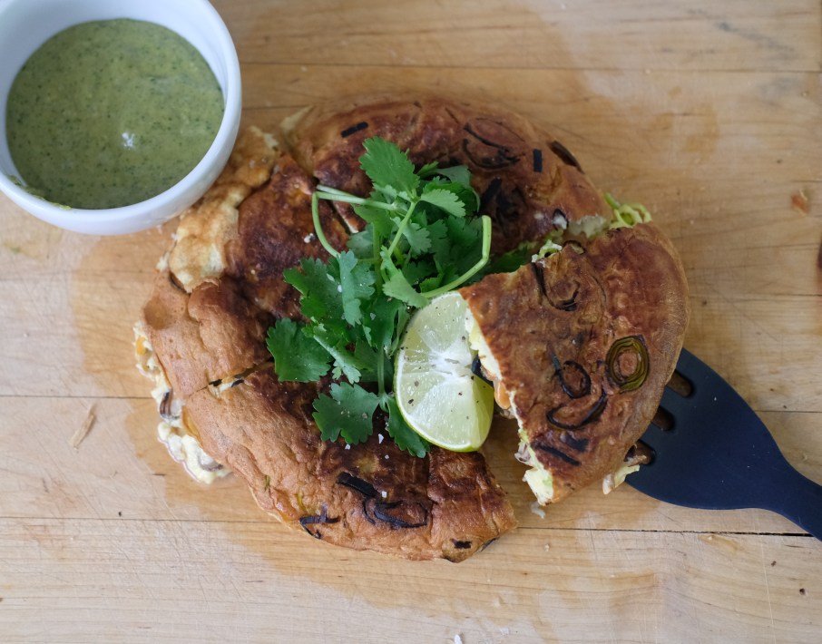 8. Turnover the omelette onto a plate. Then place back into the pan to sear the other side for roughly 15-20seconds. Remove onto a board. Cut into quarters. Garnish with coriander and a lime wedge. Accompanied by the dipping curry sauce.