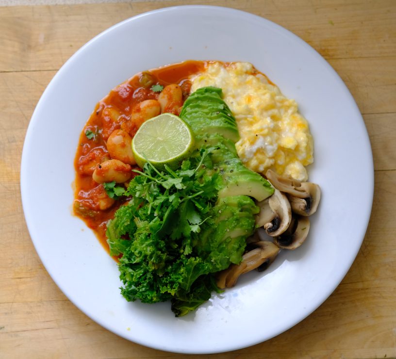 The far left features a fairly easy breakfast plate of scrambled eggs containing no dairy, steamed kale and mushrooms, thinly sliced avocado waves on top with sprinkled fresh coriander (cilantro) and a lime wedge waiting to be squeezed.