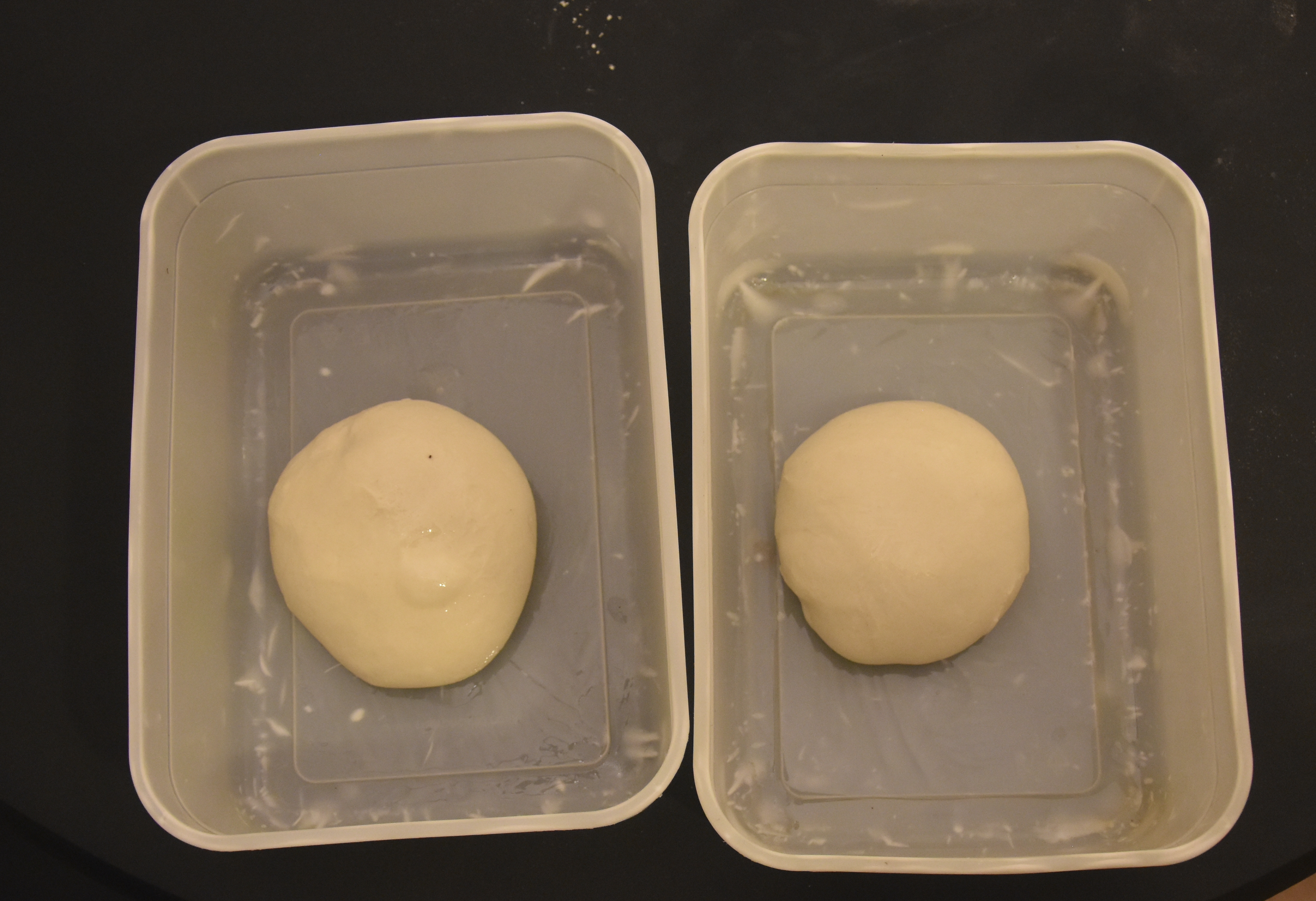- Once again, lightly brush the bottom of two airtight containers with olive oil and place the dough balls inside. Brush the top of the dough balls with olive oil, so they don’t dry out overnight and pop the lids back onto the containers.