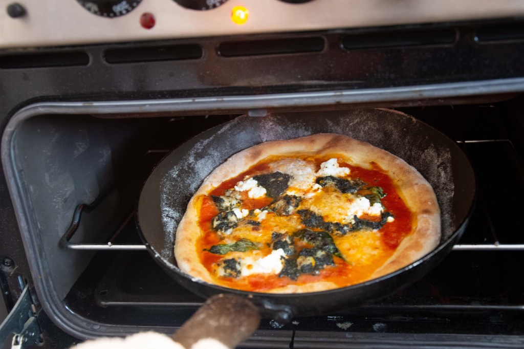 - Place the dough into the screaming hot pan, drizzle olive oil on top and allow the dough to form bubbles.