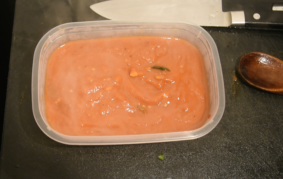 - Blend the tomatoes into a puree using a hand blender or food processor/blender. Add in the tomato puree to thicken the sauce (you may need more), basil and sugar to reduce the acidity. Season with salt and pepper. And place into a container. Allow the sauce to cool before placing into the refrigerator.