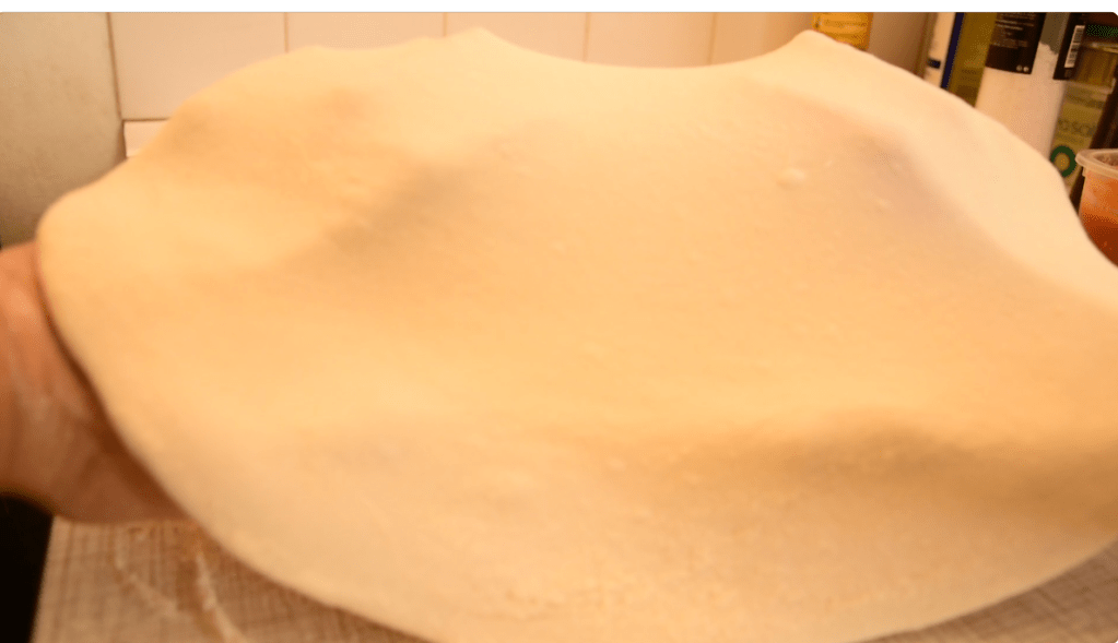- Then, lay the dough on top of your knuckles, lightly stretching the dough in rotation.