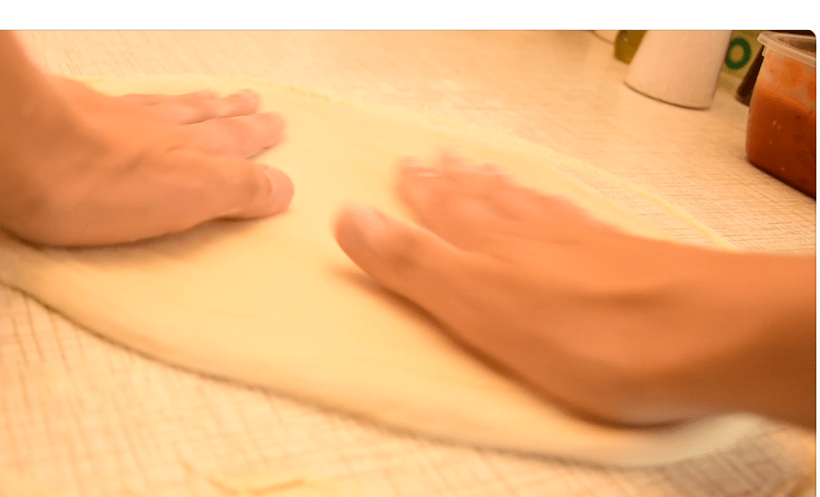 - Next, keep the dough flat on the surface. And lightly use the back sides of your hands, to stretch the outer parts of the dough, rotating the dough in an anti-clockwise turn. Pushing and stretching with the back parts of your left and right hands. Just imagine how a record spins, except you are trying to stretch your dough at the same time as spinning it.