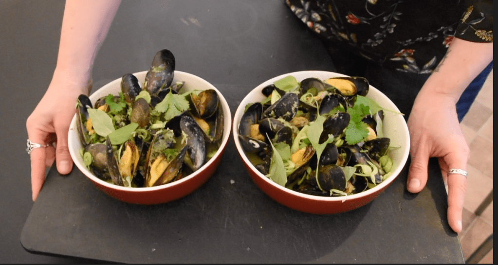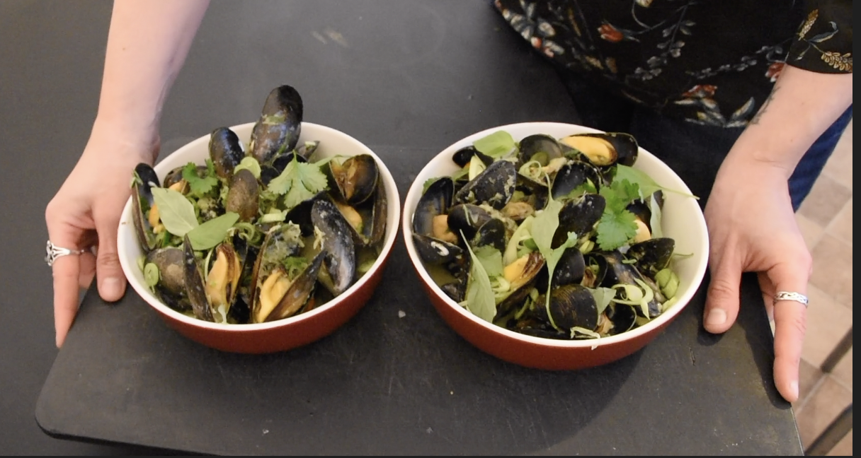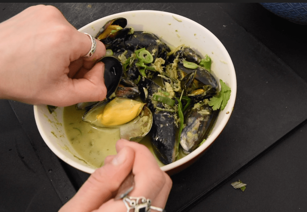 - Use a strainer or skimmer to scoop out the cooked mussels evenly, into the bowls. Then pour over the remaining liquid on top. Sprinkle fresh coriander on top, spring onions and fresh Thai basil.