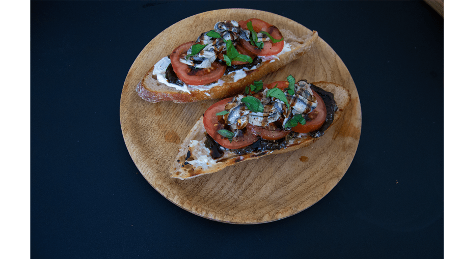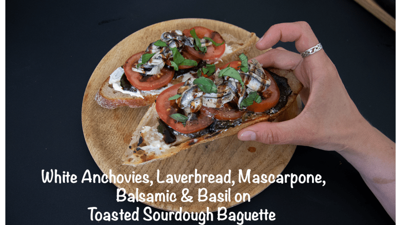 An open top sandwich delight. Consisting of toasted sourdough baguette, spread with a rich layer of mascarpone. Given a sea savour with laver, being one of the most famous Welsh ingredients in South Wales, UK. Thick slices of tomatoes layered on top, with white anchovies marinaded in basil, white vinegar and olive oil (marinade link below). Garnished with fresh basil and drizzled balsamic glaze.