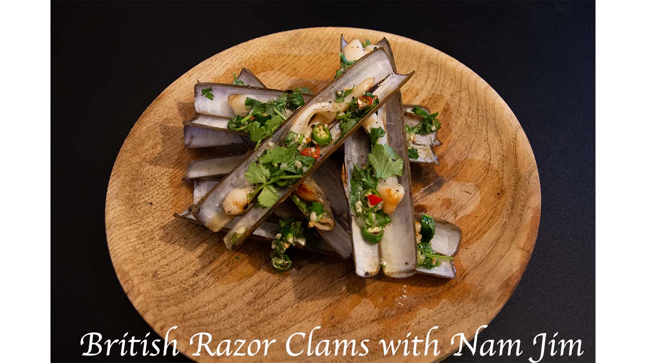 Panfried razor clams, bought from Swansea marketplace. Topped with a homemade Nam Jim dipping sauce, made without using a pestle and mortar or blender. For those who don’t own either one.