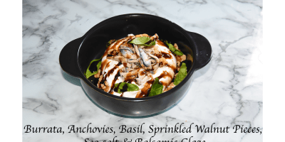 BURRATA Anchovies marinaded in white wine vinegar, basil & extra virgin olive oil, sprinkled walnuts and balsamic glaze