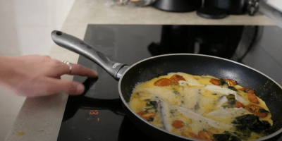 Breakfast Travels:Spinach, Cherry Tomato & White Anchovy Open Faced Omelette, Served with Mojo Verde