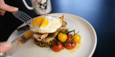 Brunch: Smoked Kippers, Back Bacon, Sausage Pickle Patty, Lavercake, Cherry Tomatoes & a Fried Egg