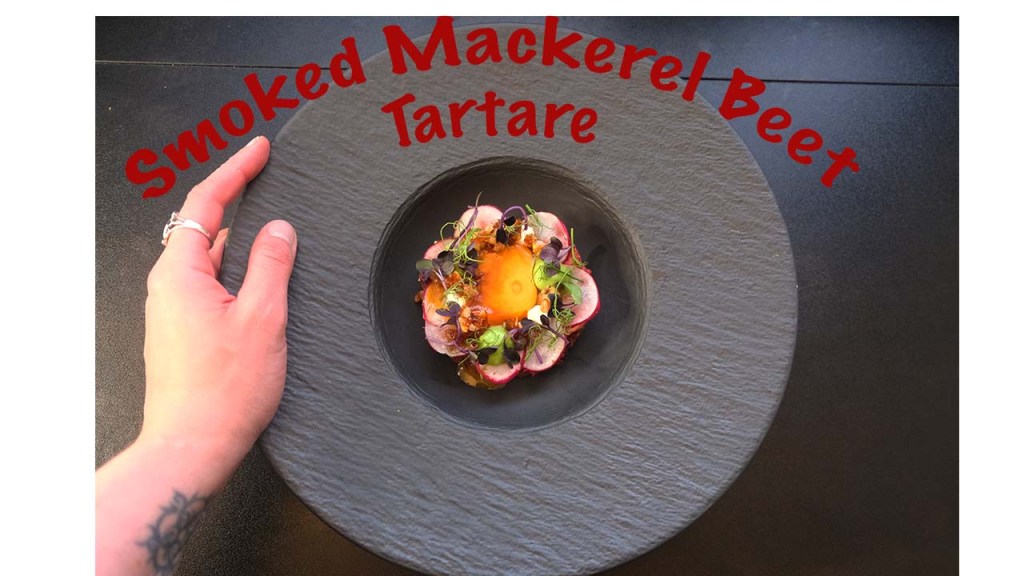 Smoked Mackerel Beet Tartare pea puree, creme fraiche, radish, cured soy mirin yolk, garnished with purple radish & pea shoots