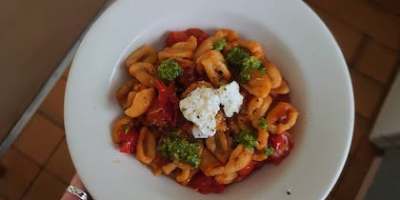 Cavatelli with Cherry Tomato sauce. Topped with Pesto & Ricotta